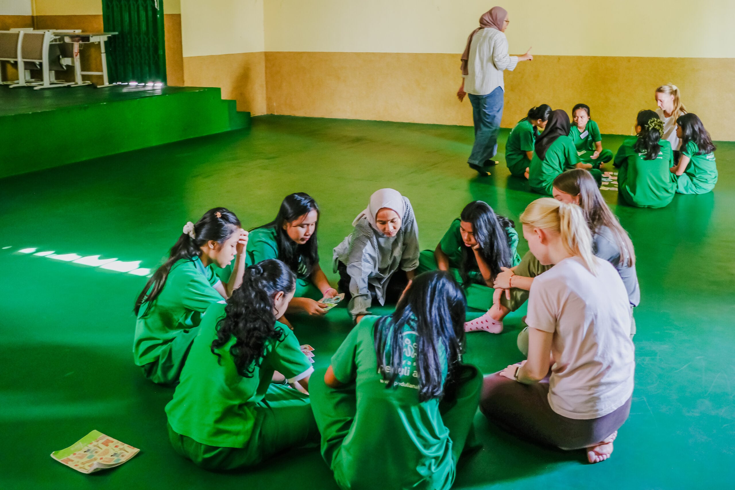 The sessions are led by three international volunteers, Robin, Linn, and Irma, together with a local volunteer, Aisha. The activities are also supported by Peduli Anak’s psychologist, Bu Zulfa, who helps guide the discussions and ensures the sessions are appropriate for the children’s emotional development.